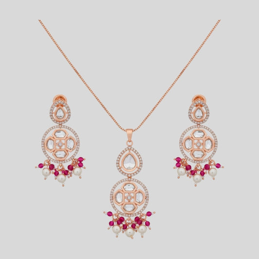 Rose Gold Kundan Pendant Necklace & Earrings Set with Ruby Beads and Pearls