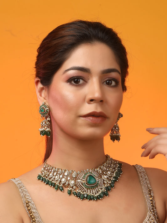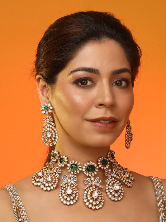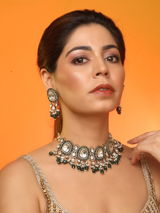 Emerald Green Kundan Polki Choker Necklace Set For Bridal Indian Jewelry
