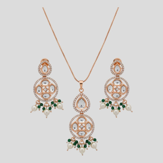 Rose Gold Kundan Pendant Necklace & Earrings Set with Ruby Beads and Pearls