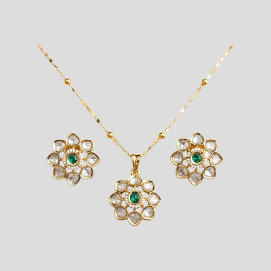 Gold-Plated Floral Kundan Pendant Necklace & Earrings Set with Green Stone Cente