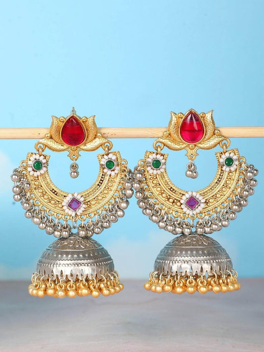 Chandbali Jhumka Dual-Tone Earrings with Ruby Stone & Detailing Ghungroo