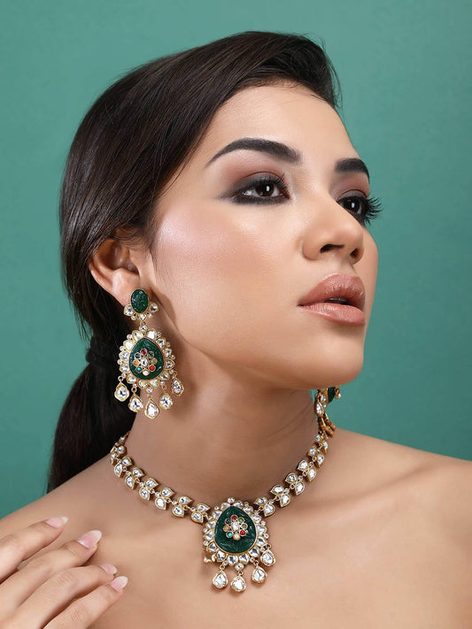 22KT Gold Plated Kundan Classic Green Necklace Set