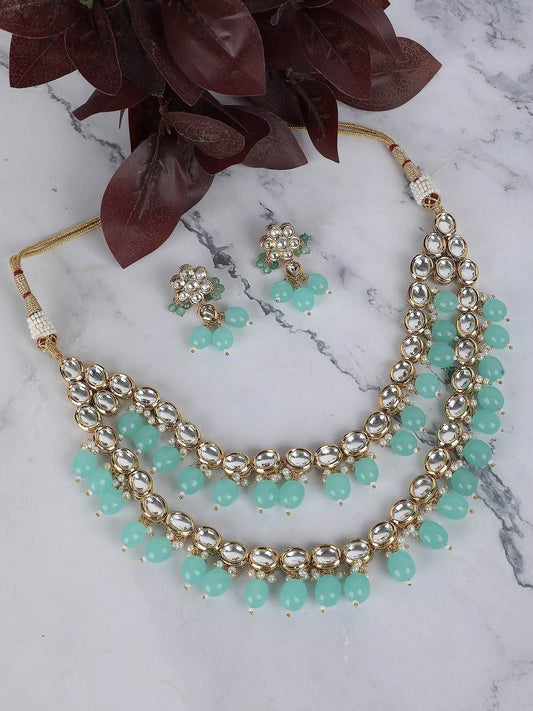 Elegant Kundan Necklace Set with Aqua Blue Beads