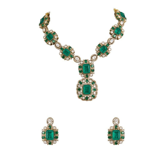 Emerald Teardrop Polki Necklace Set with Crystal-Studded Statement Earrings