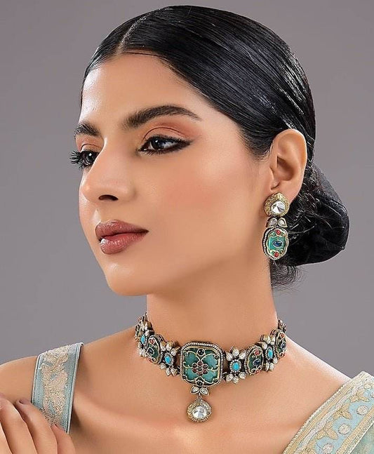 Gold Finish Kundan Polki & Emerald Stone Choker Necklace Set
