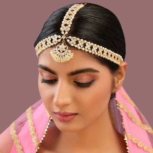 Gold Finish Kundan Polki & Pearl Beaded Dangler Earrings With Maangtikka