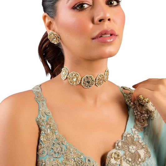 Gold-Plated Kundan Choker Necklace with Matching Earrings