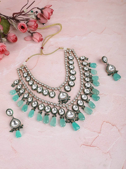 Gold-Plated Kundan Necklace Set with Green Bead Drops