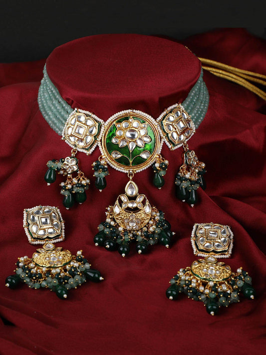 Green Stone & Pearl Embellished Kundan Choker Necklace Set