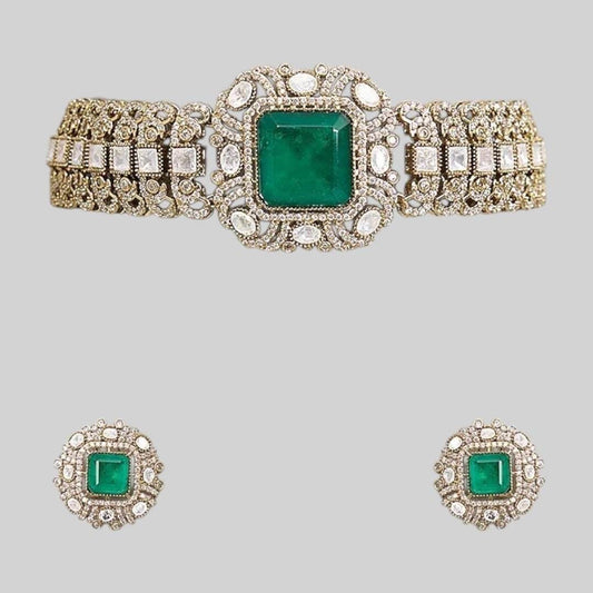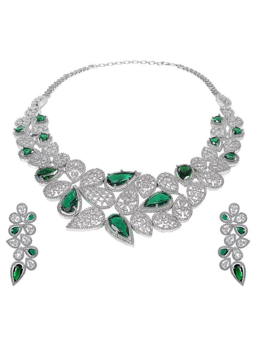 Green Rhodium Plated American Diamond Necklace Set For Women