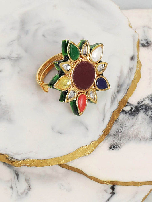 Luxurious Sterling Silver Gold Plated Kundan Multicolor Ring