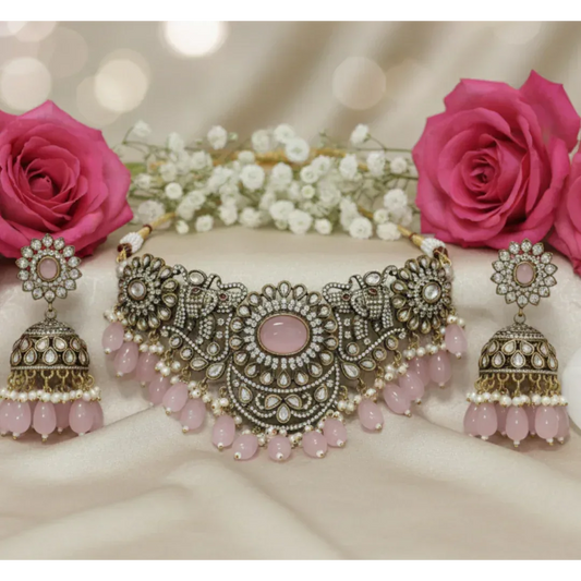 Antique Oxidized Pink Beads Choker Necklace Set with Earrings for Women