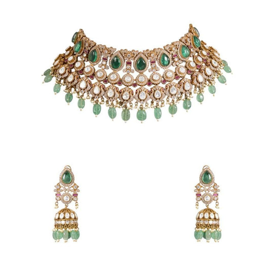 Royal Green Kundan Choker Necklace Set with Earrings for Women