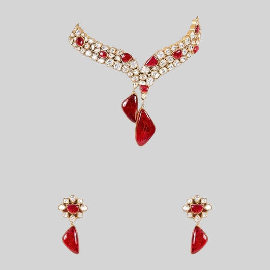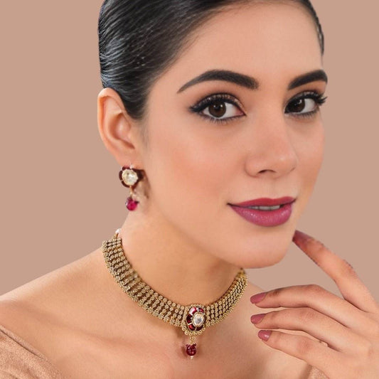 Ruby Red Stone Studded Choker Necklace Set with Gold-Plated Drop Earrings