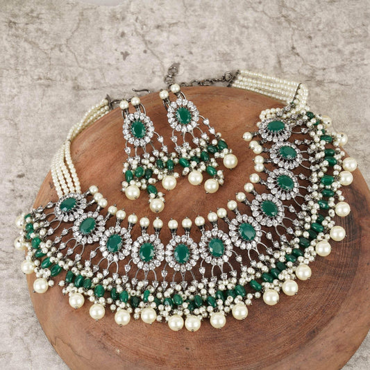 Rhodium Plated American Diamond Zircon Green Necklace Set For Girls