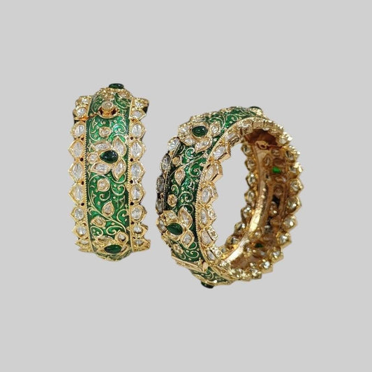 Gold-Plated Kundan Bangles with Green Enamel Work