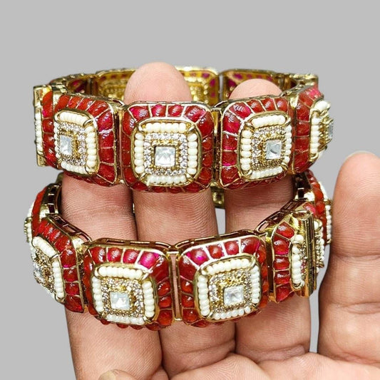 Elegant Red and White Enamel Traditional Kundan Bracelet Set with Square Shaped Stones