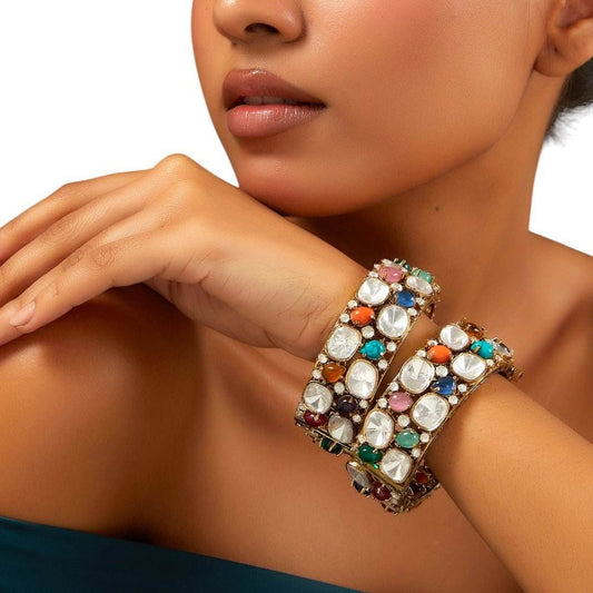 Gold Finish Multi-Colored Kundan Polki Bangles (Set of 2)
