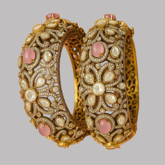 Antique Gold-Plated Kundan Bangles with Pink Stone & Polki Work