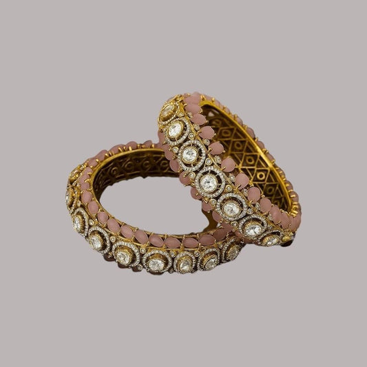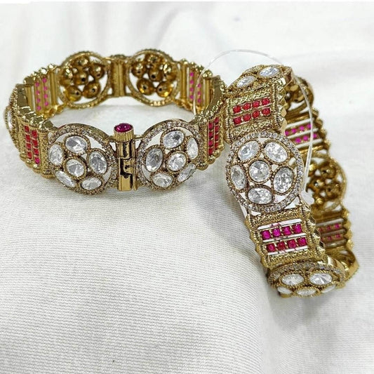 Luxury Gold-Plated Kundan Bangles with Pink Stone & White Polki Crystals