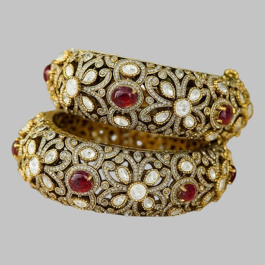 Antique Gold-Plated Kundan Bangles with Red Stone & Polki Floral Design