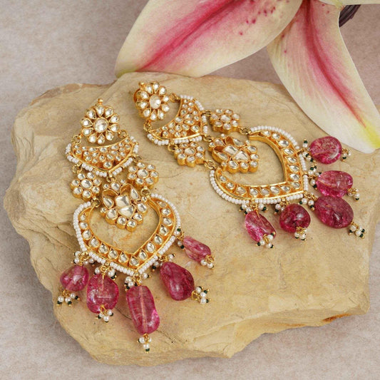 Elegant Kundan Chandelier Earrings with Pink Stone Drops