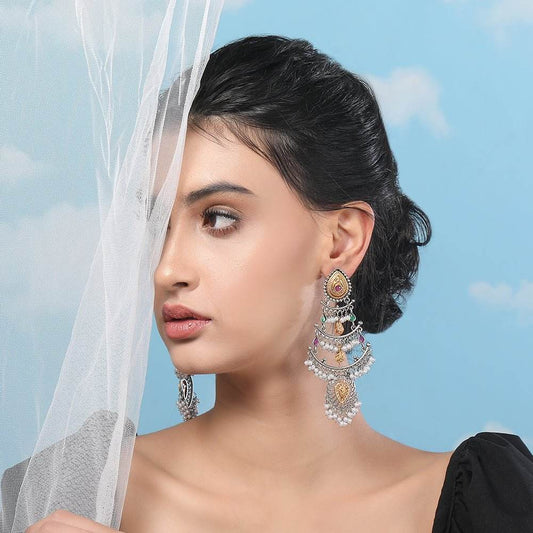 Chandbali Jhumka Dual-Tone Earrings with Ruby Stone & Detailing Ghungroo