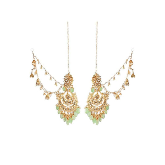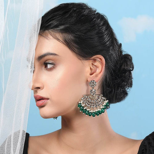 Royal Kundan Green Beaded Chandbali Earrings with Ear Chain