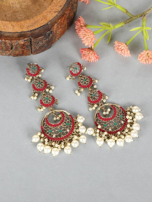 Ethnic Red Gold Crescent Chandbali Dangles with Pearl Drops and Kundan