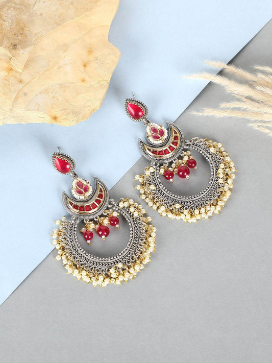 Red Crescent Oxidized Silver Hoop Earrings with Pearl Drops and Kundan Work