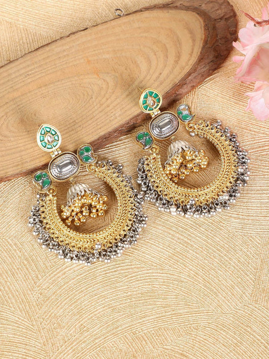 Vintage Gold Silver Double Tone Hoop Earrings with Green Kundan and Dome Jhumka