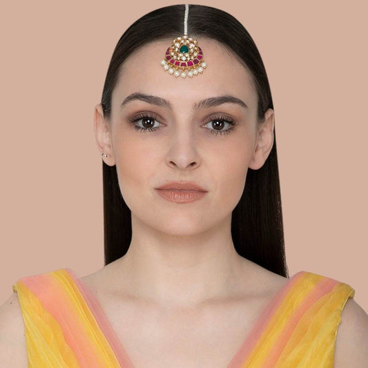 Plated Gold and Red Maangtikka with Pearl and Stone