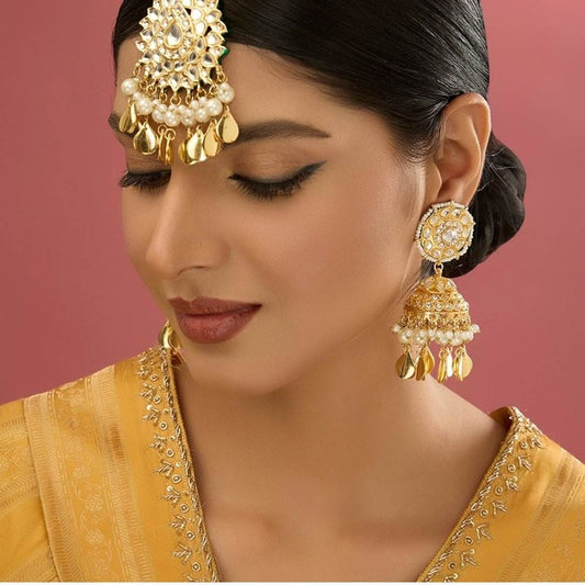 Gold Finish Kundan Polki & Pearl Beaded Dangler Earrings With Maangtikka