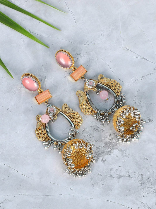 Gold-Toned Pink Dual-Metal Dangler Jhumka Earrings