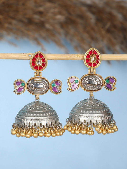 Chandbali Jhumka Dual-Tone Earrings with Ruby Stone & Detailing Ghungroo