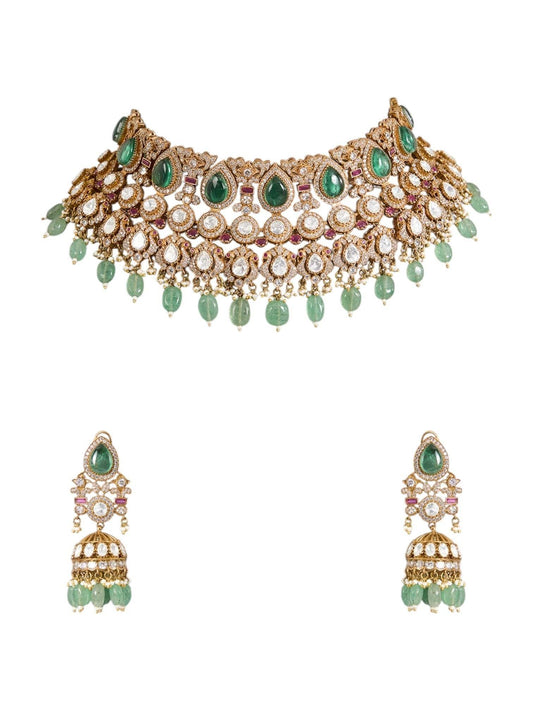 Gold Finish Kundan Polki & Emerald Stone Choker Necklace Set