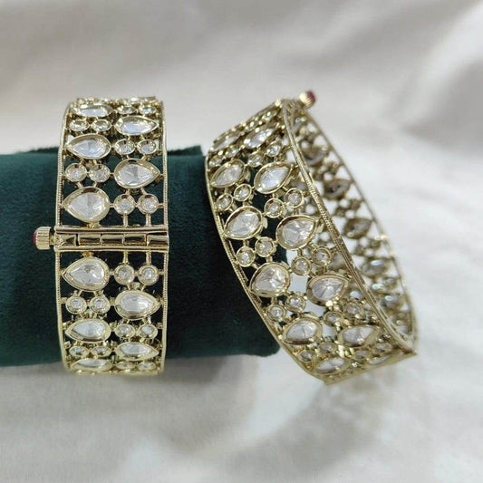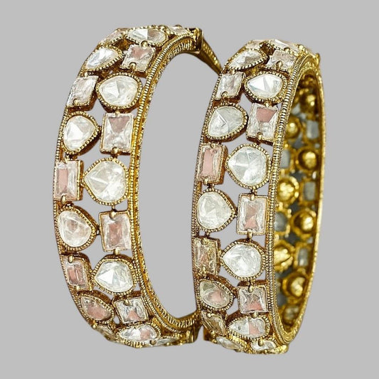 Elegant Kundan-Style Gold Plated Bangles with White Polki Stones