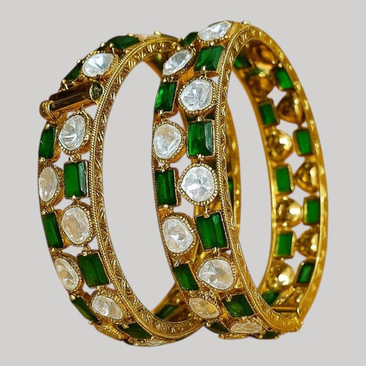 Gold-Plated Green & White Stone Studded Ethnic Bangles for Women
