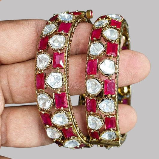 Traditional Kundan Stone Gold-Plated Bangles with White & Pink Polki Work for Women