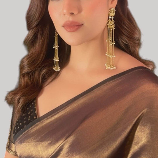 Traditional Long Golden Dangler Earrings with Multi-Strand Pearl Chains