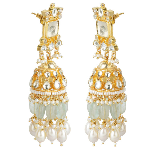 Gold-Plated Kundan Jhumka Earrings with Pink & Green Stones
