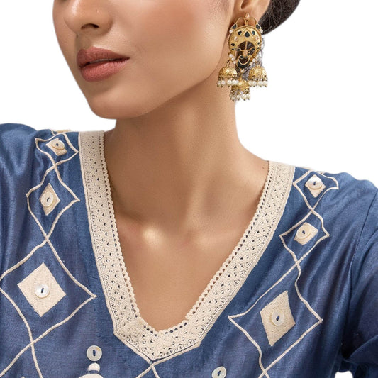 Gold-Plated Crescent Earrings with Black Enamel & Triple Jhumka Drops