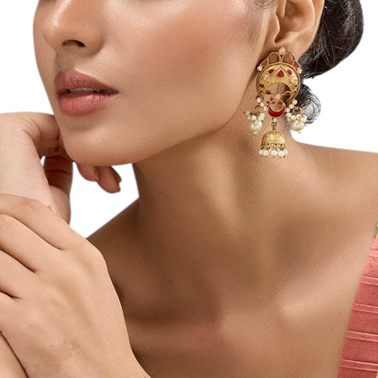 Gold-Plated Red Enamel Jhumka Earrings with Pearl Drops