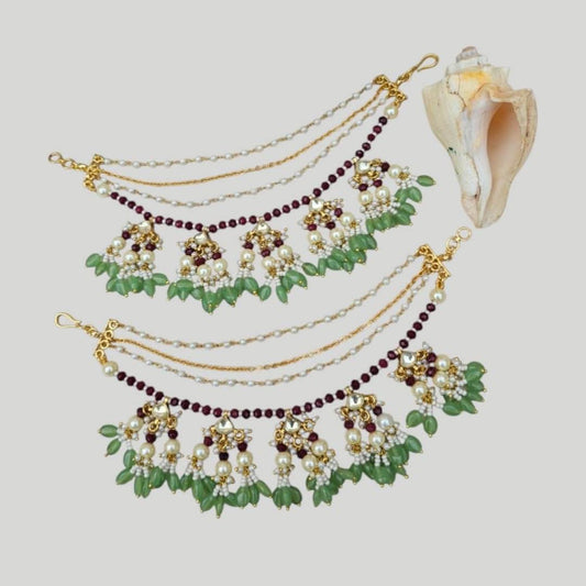 Green & Maroon Kundan Pearl Multi-Layer Kaan Chain