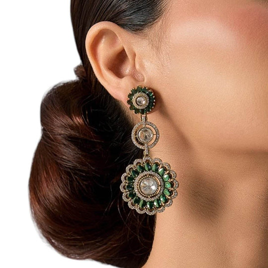 Antique Gold-Plated Green Kundan Floral Dangle Earrings for Women