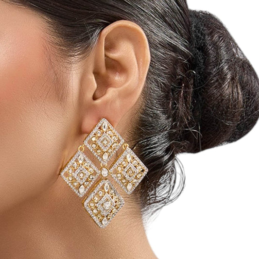 Designer Gold-Toned & White Kundan Studded Square Drop Earrings for Women