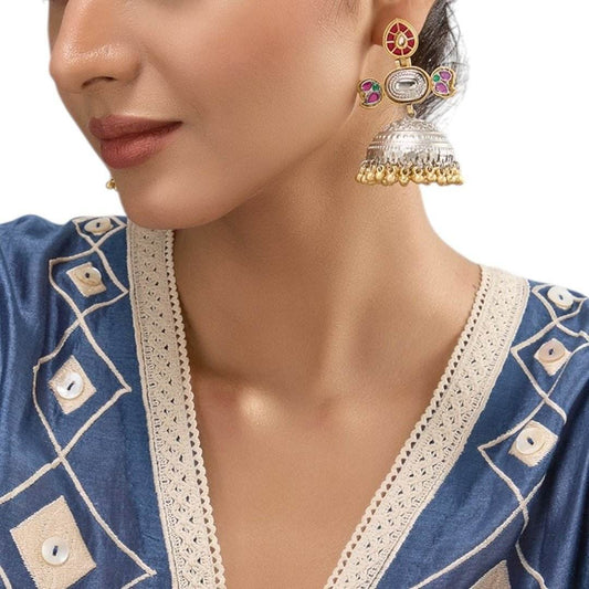 Dual-Tone Oxidized Jhumka Earrings with Colorful Enamel & Golden Beads