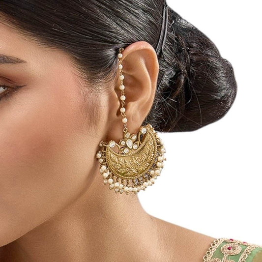 Gold-Plated Pearl Embellished Traditional Ear Chain Chandbali Earrings for Women