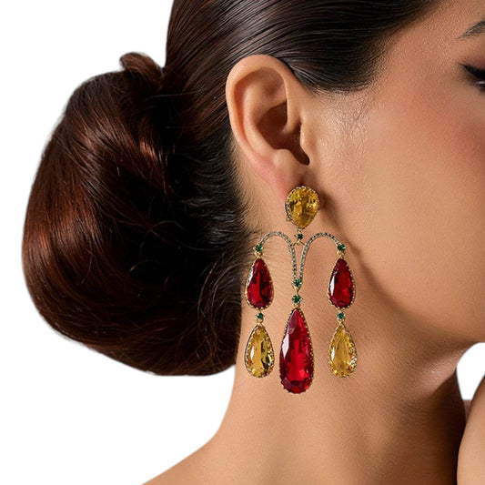Gold-Plated Red & Yellow Statement Teardrop Earrings with Green Accents