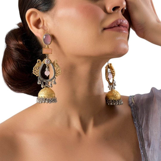 Gold-Tone Dual Peacock Jhumka Earrings with Pink Stone & Silver Ghungroo Drops